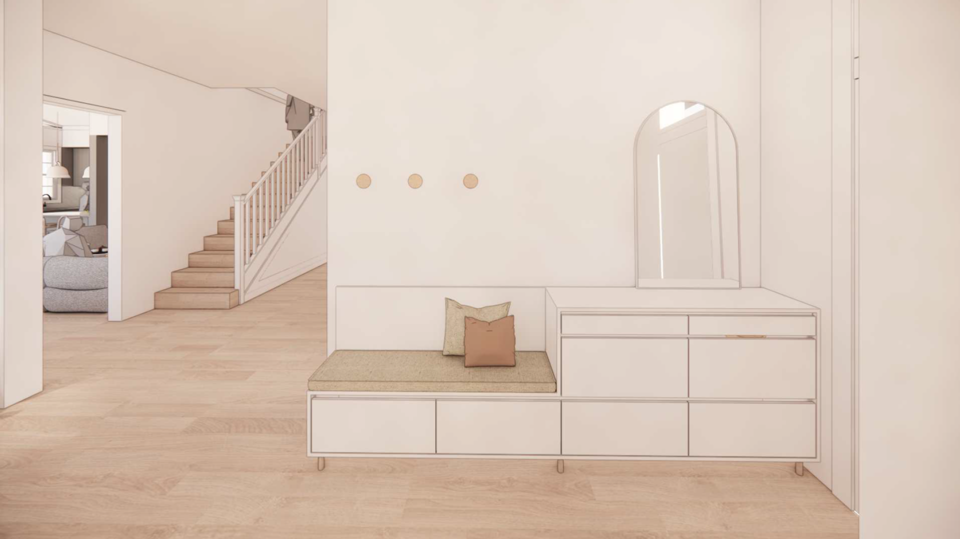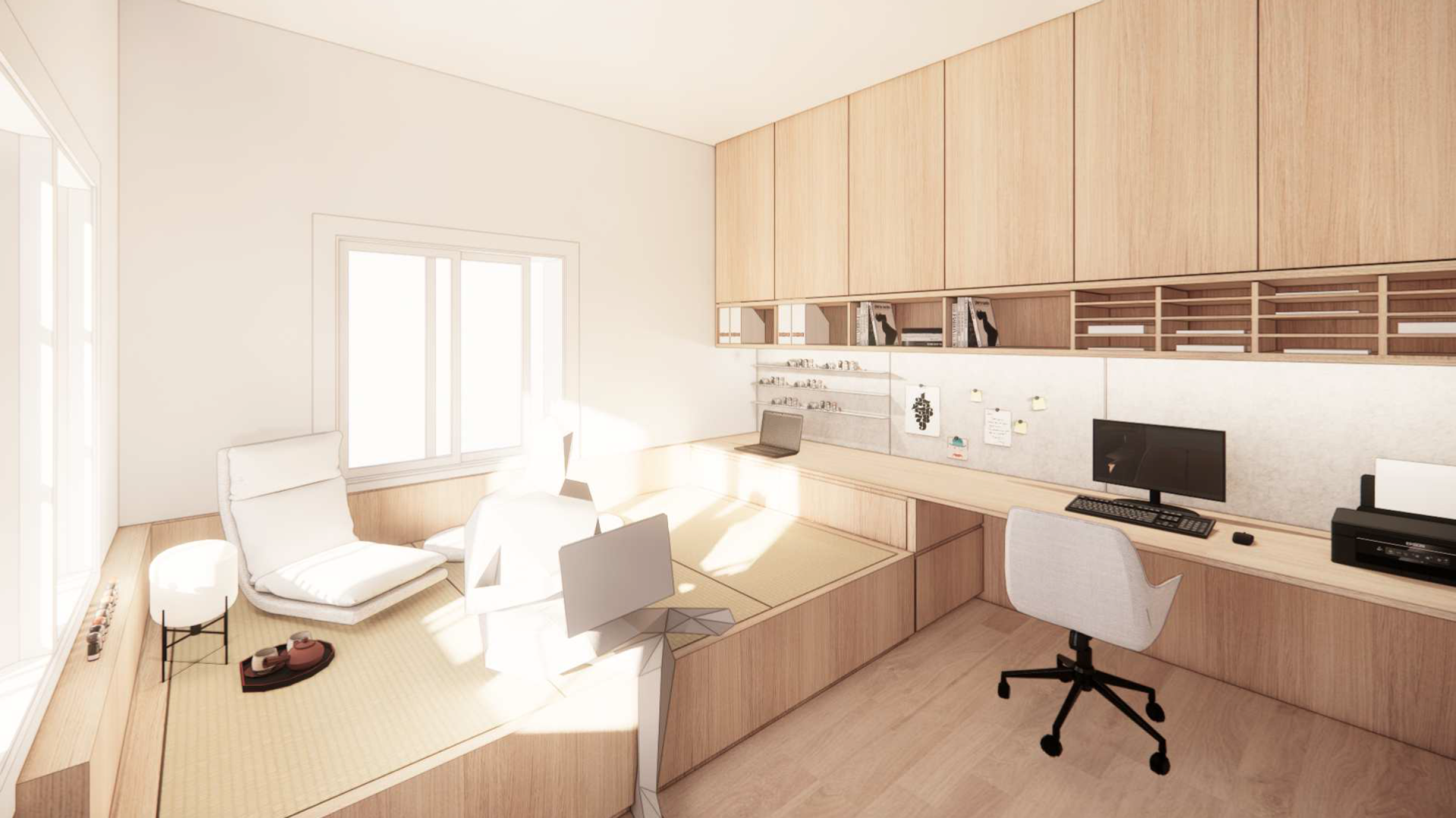The space features thoughtful oriental influences, including a functional Tatami area with integrated storage. Every detail is grounded in natural elements and tones, meticulously planned to harmonize with the natural light, resulting in a home that is both visually dramatic and deeply cozy.